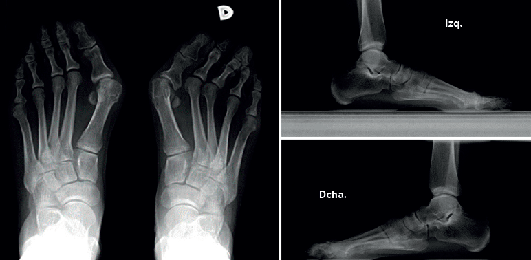 Para realizar una correcta evaluación radiológica se deben realizar al menos 2 proyecciones en carga, una proyección dorsoplantar y una lateral del pie (Figura 2).