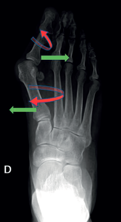 Consiste en una alteración de la articulación metatarsofalángica (MTF) del primer radio del pie. Es una deformidad compleja que incluye, por un lado, la desviación del primer dedo del pie (hallux o dedo gordo) hacia el resto del pie, alejándolo de la línea media del cuerpo (abducto), con una rotación en el plano frontal (pronación del primer dedo). Por otro lado, también incluye la desviación del primer metatarsiano (M1), aproximándolo a la línea media del cuerpo (varo de M1), con una pequeña rotación externa, como se puede ver en la Figura 1. Esta modificación de la articulación afecta a todas las estructuras anatómicas próximas, como la cápsula articular, los ligamentos colaterales, los huesos sesamoideos, la musculatura intrínseca y la extrínseca)(2).