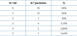- No se ha tenido en cuenta en la valoración el número de AD pautados en cada paciente. Se recoge el dato en el estudio descriptivo, pero no se analiza la influencia del mayor o menor número de AD en los resultados subjetivos de la intervención. No se ha realizado un estudio del subgrupo de pacientes que toman AD en función del número de fármacos que consumen debido al limitado tamaño muestral.