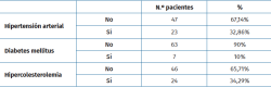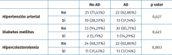 La incidencia de enfermedades previas tampoco presentó diferencias estadísticamente significativas entre grupos. El grupo sin tratamiento AD presentó un total de 10 pacientes con HTA, 2 con DM2 y 11 con DL. El grupo de pacientes bajo tratamiento con AD incluyó 13 pacientes con HTA, 5 con DM2 y 13 con DL. La distribución por grupos de estas enfermedades concomitantes queda reflejada en la Tabla 4.