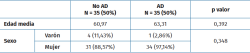 El grupo de los pacientes que se encontraba bajo tratamiento con AD presentó una edad media de 63,31 años. De los 35 pacientes de este grupo, 34 fueron mujeres y solo hubo un varón. No se encontraron diferencias estadísticamente significativas entre ambos grupos en las variables demográficas, como se recoge en la Tabla 3.
