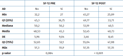 Antes de la intervención, los valores medios del cuestionario SF-12 fueron similares entre ambos grupos. La media del grupo sin AD fue de 48,5, mientras que la media del grupo con AD fue de 45.