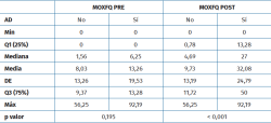 Antes de la intervención, ambos grupos mostraron valores bajos, aunque el grupo con depresión presentó una puntuación media más alta (26,39) frente al grupo sin depresión (8,03), por lo que se reflejó que el grupo con AD presentó una mayor afectación o un peor estado funcional. Del mismo modo, se analizaron los resultados de los cuestionarios MOXFQ aplicando la prueba t de Student. Se obtuvo un valor estadísticamente no significativo (p = 0,195) para los resultados del cuestionario preintervención, pudiendo afirmar que los resultados de los cuestionarios MOXFQ y, por tanto, el dolor en el pie asociado a las actividades básicas de la vida diaria, antes de la intervención quirúrgica no presentaron diferencias significativas entre los grupos.