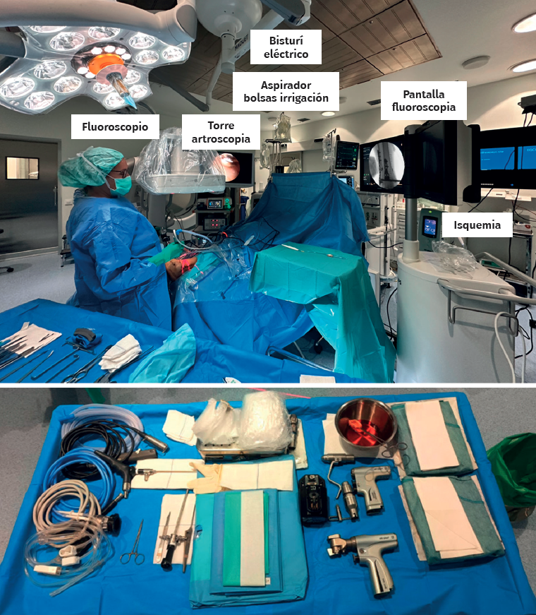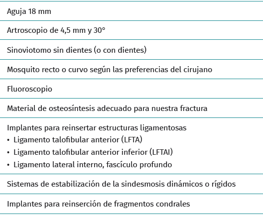 En primer lugar, realizaremos el abordaje posterior, si lo requiere la fractura, y, tras reducir el maléolo posterior, colocamos al paciente en decúbito supino con una almohadilla debajo del glúteo. El tobillo debe ir colocado al borde de la mesa de quirófano, lo que permitirá la flexoextensión libre del tobillo, facilitando el manejo durante la artroscopia. La isquemia y los sistemas de aspiración e irrigación de agua los colocaremos al mismo lado de la fractura (pero puede variarse según las peculiaridades técnicas de cada hospital). La torre de artroscopia y el monitor del fluoroscopio cerca de la cabeza del paciente y, en el lado contralateral, colocaremos el arco en C en la parte inferior para optimizar la visualización y el acceso artroscópico y radiológico, permitiendo su uso de forma simultanea(7) (Figura 1 y Tabla 1).