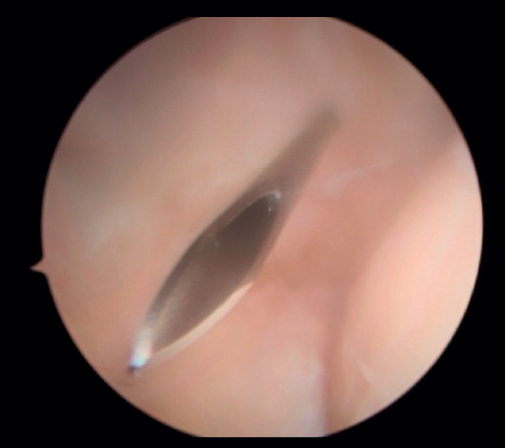 Figura 8. Tenotomía del extensor carpi radialis brevis con vaporizador (paciente en decúbito lateral, codo derecho, visión desde el portal medial).