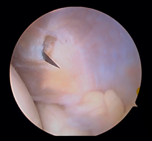 Figura 5. Realización del portal lateral (paciente en decúbito lateral, codo derecho, visión desde el portal medial).