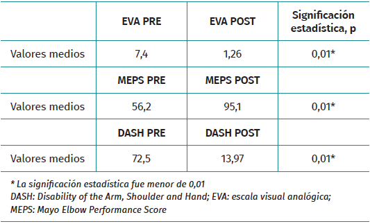 Results: an improvement of 6.15 ± 1.06 points in the VAS, 38.90 ± 8.25 points in the MEPS, and 58.56 ± 11.86 points in the DASH scale (mean ± standard deviation) was observed. Statistically significant differences were found in all cases (p < 0.01). Three patients experienced delayed wound healing without further complications, and 2 required mobilization under anesthesia due to residual stiffness.