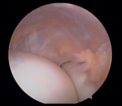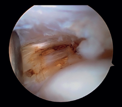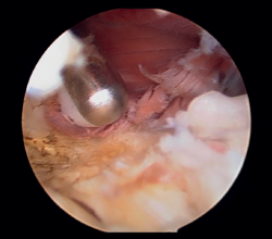 Figura 7. Tendón extensor carpi radialis brevis tras capsulotomía lateral (paciente en decúbito lateral, codo derecho, visión desde el portal medial).