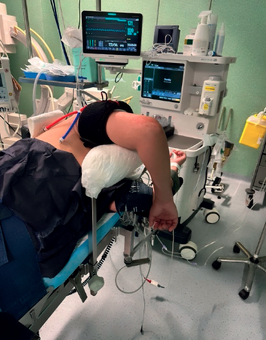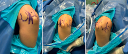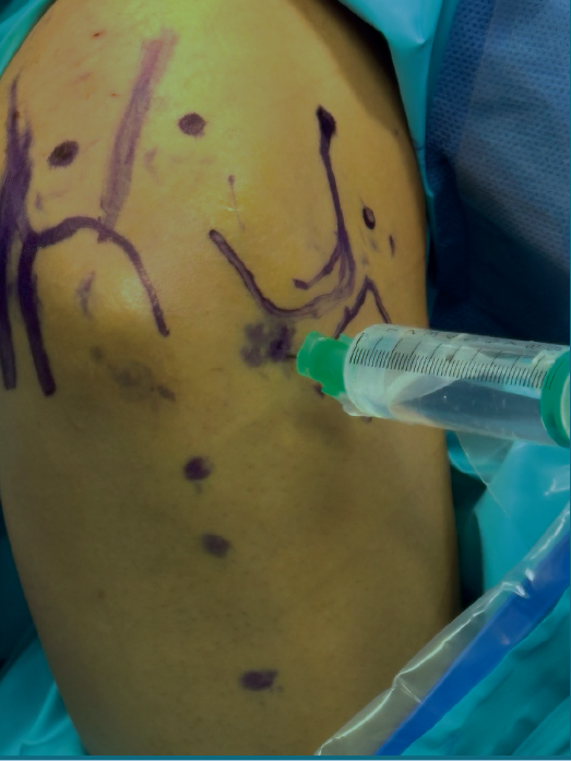 Los pacientes se colocan en decúbito lateral sobre el lado no afecto, posicionando el codo a tratar sobre un soporte a 90° dejando la mano libre para poder movilizarla (Figura 1). Se posiciona el manguito de isquemia en la parte superior del brazo, lo más próximo a la axila que sea posible, para tener suficiente campo quirúrgico. Se marcan las referencias anatómicas (epicóndilo medial, septo fibromuscular medial, nervio cubital, tendón del tríceps, olécranon, epicóndilo lateral y borde lateral supracondíleo del húmero, cabeza del radio y capitellum), el soft point o triángulo de seguridad entre la cabeza del radio, el olécranon y el epicóndilo lateral (Figura 2). En primer lugar, se introducen unos 20 mL de suero fisiológico (SF) en la articulación para distender la cápsula articular, favoreciendo el acceso y alejando las estructuras anatómicas en riesgo, así como los portales de visión medial proximal y el portal de trabajo lateral proximal (Figura 3). Se usa una óptica convencional de 4 mm y 30°, y se trabaja en el compartimento anterior del codo. Se usa un sinoviotomo de 3,5 y vaporizador de 50°. No se usa bomba de infusión ni cánulas.
