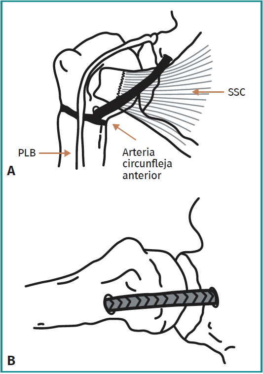 Figura 4. A: representación gráfica de ligamentoplastia sintética con el hombro en posición neutra; B: hombro en abducción. PLB: porción larga del bíceps; SSC: subescapular.