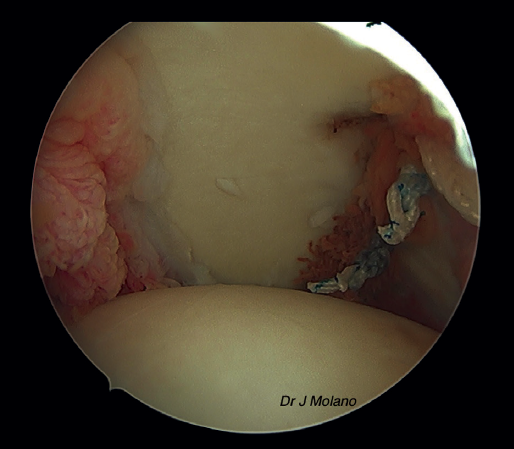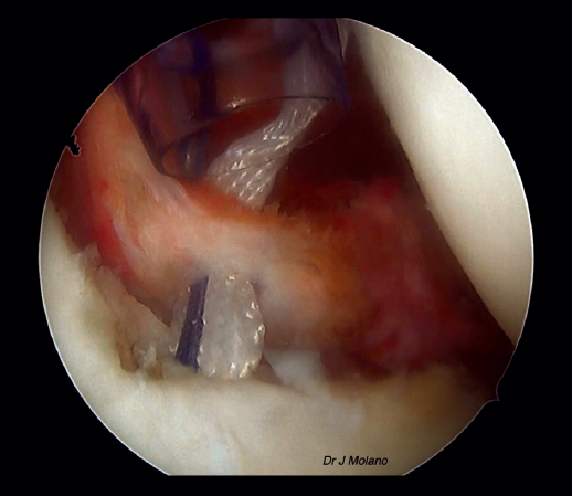 Figura 7. Visión artroscópica desde el portal superior tras anudado de remplissage, implantación intraarticular de la ligamentoplastia y reparación capsulolabral que oculta el ligamento.