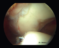 Figura 2. Visión artroscópica desde el portal superior de un hombro derecho con lesión Hill-Sachs off track; defecto glenoideo del 20%.