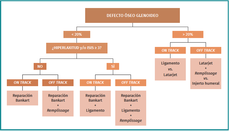 En nuestro centro, se sigue un algoritmo de tratamiento establecido para el tratamiento de la inestabilidad anterior de hombro. En este algoritmo, lo primero que hay que valorar es el defecto óseo glenoideo, que se divide en función de si es > 20% o < 20%. En el caso de los pacientes con un defecto óseo glenoideo < 20%, se valora la hiperlaxitud y/o el ISIS, estudiando así el riesgo de reluxación. Finalmente, se valora el tipo de lesiones bipolares, para poner en relación el Hill-Sachs y el Bankart óseo. Así, tal y como se describe en la bibliografía y simplificando, lesiones pequeñas de Hill-Sachs y Bankart (on track) tendrían un menor riesgo de reluxación, a diferencia de lesiones más extensas (off track), por lo que la reparación capsulolabral artroscópica podría ser insuficiente en estas últimas(5-7,9-11,13-15) (Figura 1).