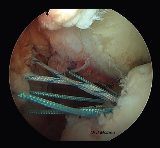 Figura 3. Visión artroscópica desde el portal superior de un hombro derecho. Se observa Hill-Sachs tras pasar las suturas de remplissage, antes del anudado final.