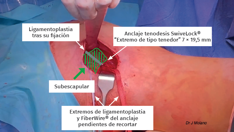 Tras ello, se cambia nuevamente la visión al portal posterior y se empieza con la preparación glenoidea de la ligamentoplastia de hombro. Se coloca con motor una aguja de Kirschner de 2,2 mm de diámetro a las 3 horas (hombro derecho) o 9 horas (hombro izquierdo), utilizando como guía la de PushLock® (Arthrex, Naples, FL, USA). Sobre ella se realiza un túnel de 4,5 × 20 mm con broca canulada de 4,5 mm. Posteriormente, se fija el ligamento AchilloCord PLUS® (Xiros, Leeds, UK) en la cara anterior de la glena mediante un tornillo interferencial de tenodesis de tipo Peek® de 4,75 × 15 mm (Arthrex, Naples, FL, USA). Se mantiene en el portal anterior, pero por fuera de la cánula, el ligamento y se continúa con la reparación de Bankart. Habitualmente, en nuestro centro se realiza con 2 anclajes de tipo Iconix® de 1,4 mm, de tipo todo hilo, por debajo de la implantación del ligamento y 1 o 2 por encima que pueden ser Iconix® o PushLock®.