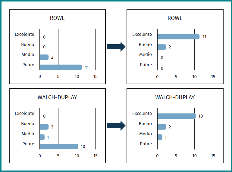Tras la intervención, los resultados en las escalas se invierten, siendo 10 pacientes (76,9%) los que presentan resultados excelentes con una media de 96,5 ± 4,1 puntos y 2 (15,3%) con resultados buenos con 78 ± 11,3 puntos de media en la escala de Walch-Duplay. Esto se debe en su mayoría a la ausencia de molestias, dolor o aprehensión tras la intervención y a la ganancia de rotación externa tras la aplicación de la técnica combinada. En cuanto a la escala de Rowe, los resultados obtenidos postoperatoriamente son de 11 pacientes (84,6%) con resultados de 95 ± 5,5 puntos de media y 2 pacientes (15,3%) con 85 ± 7,1 puntos de media, debido a las mismas razones (Figura 8).