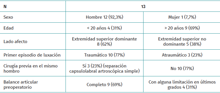 Resultados: 12 de los 13 pacientes de la muestra fueron hombres y solo 4 tenían menos de 20 años. De todos los pacientes, 10 habían tenido un primer episodio de luxación traumático y únicamente 3 de los pacientes de toda la muestra habían sido intervenidos del mismo hombro previamente. De la muestra, 10 pacientes presentaban una media de 30 puntos en la escala de Walch-Duplay y 11 de ellos 35 puntos de media en la escala de Rowe preoperatoriamente, es decir, resultados pobres. Tras un seguimiento mínimo de 1 año, > 80% presentaba resultados excelentes o muy buenos en las mismas escalas, elevando a 96,5 los puntos en la escala de Walch-Duplay y a 95 puntos en la de Rowe, sin que ningún paciente empeorara su valor preoperatorio. El análisis de los resultados con la prueba de McNemar mostró una mejoría estadísticamente significativa. Además, ningún paciente presentó efectos adversos ni reluxaciones y 9 de ellos lograron volver a su deporte habitual al mismo nivel previo a la lesión.