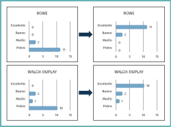Figura 8. Gráficos comparativos de los resultados pre- y postoperatorios de las escalas de Rowe y Walch-Duplay.