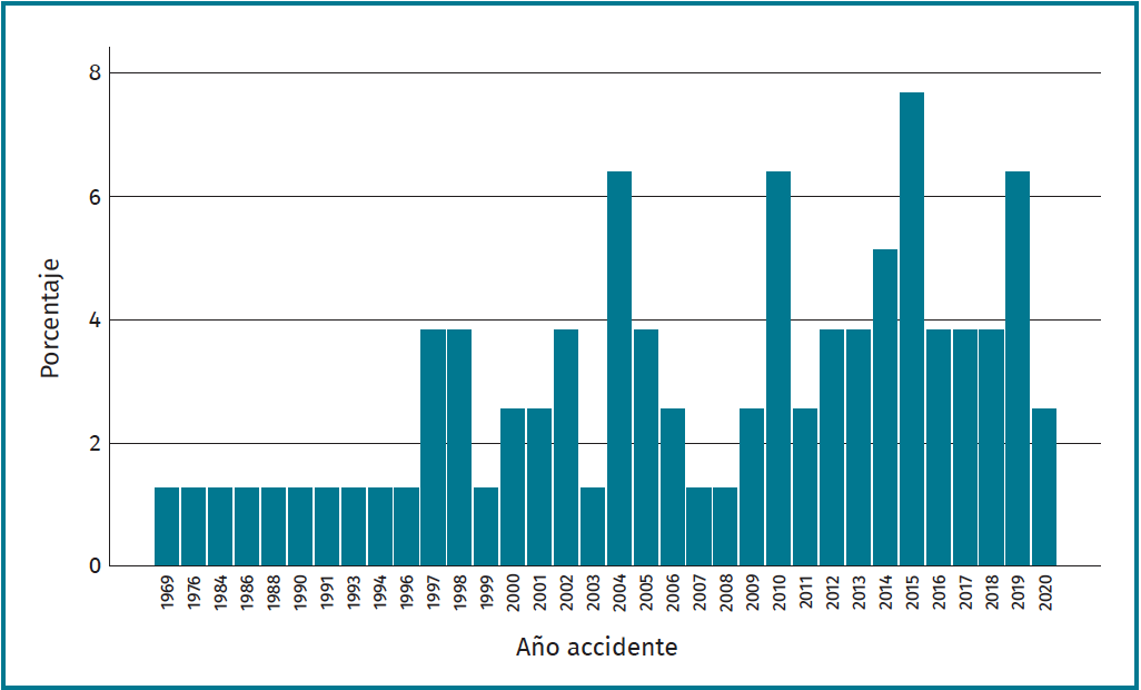 Los años en los que aparece una mayor tasa de este tipo de accidentes van desde 2004 a 2015. Este dato se puede relacionar con un mayor número de trabajadores en activo en esas fechas y la incorporación de los trabajadores autónomos al reconocimiento del accidente laboral en el año 2003. Según los datos de población activa, en el año 2005 se produjo un incremento de personas ocupadas de 12,6 millones en 1996 a 18,9 millones en 2005(9).
