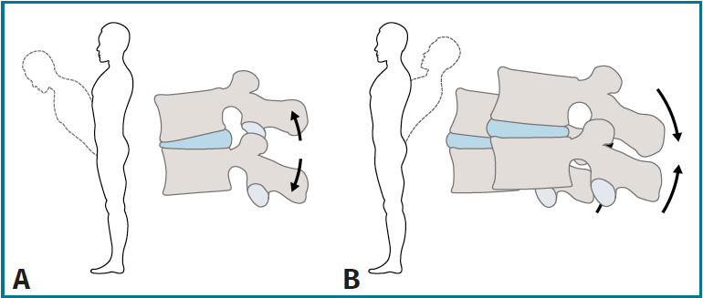 Figura 3. Método McKenzie: fenómeno de movimiento del núcleo pulposo dentro del disco intervertebral, según la posición adoptada y la dirección de los movimientos de la columna: A: en flexión; B: en extensión.