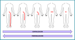 Figura 2. Términos específicos del método McKenzie: “centralización” (desplazamiento de los síntomas desde la periferia en los miembros inferiores hacia la línea media de la columna), “periferalización” (desplazamiento del dolor lejos de la línea media de la columna o hacia miembros inferiores), “preferencia direccional” (movimiento o postura que provoca la centralización y con ello la disminución o abolición de los síntomas y la mejora del movimiento).
