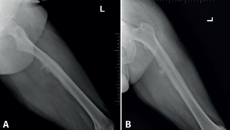 Figura 3. Radiografías del fémur izquierdo. A: proyección anteroposterior, con lesión ósea permeativa en la diáfisis femoral con reacción perióstica; B: proyección lateral, con irregularidad cortical y masa de las partes blandas adyacente, sugestiva de lesión tumoral.