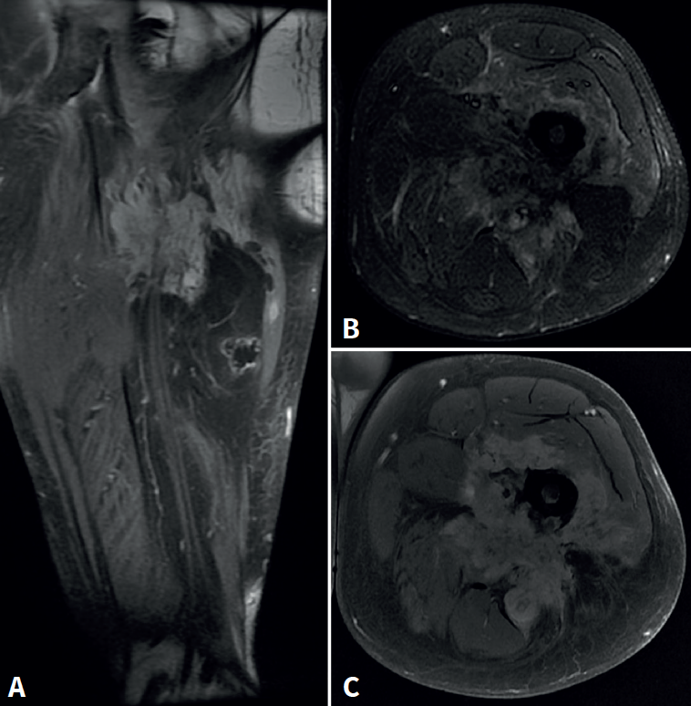 Figura 4. Resonancia magnética del fémur izquierdo. A: corte coronal en secuencia STIR, con masa de partes blandas de gran tamaño con afectación diafisaria femoral; B: corte axial en secuencia T2, con masa heterogénea con áreas de necrosis central; C: corte axial en secuencia T1 con supresión grasa, con compromiso del trayecto del nervio ciático por la masa tumoral.