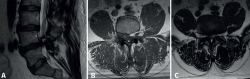 Figura 1. Resonancia magnética lumbar inicial. A: corte sagital en secuencia T2: discopatía de grado IV en L4-L5 con hernia discal extruida; B: corte axial en secuencia T1 a nivel de L4-L5, con estenosis del receso lateral derecho secundaria a extrusión discal; C: corte axial en secuencia T2, con protrusión discal difusa con estenosis foraminal bilateral y canal medular estrecho (grado C según Schizas-Theumann).